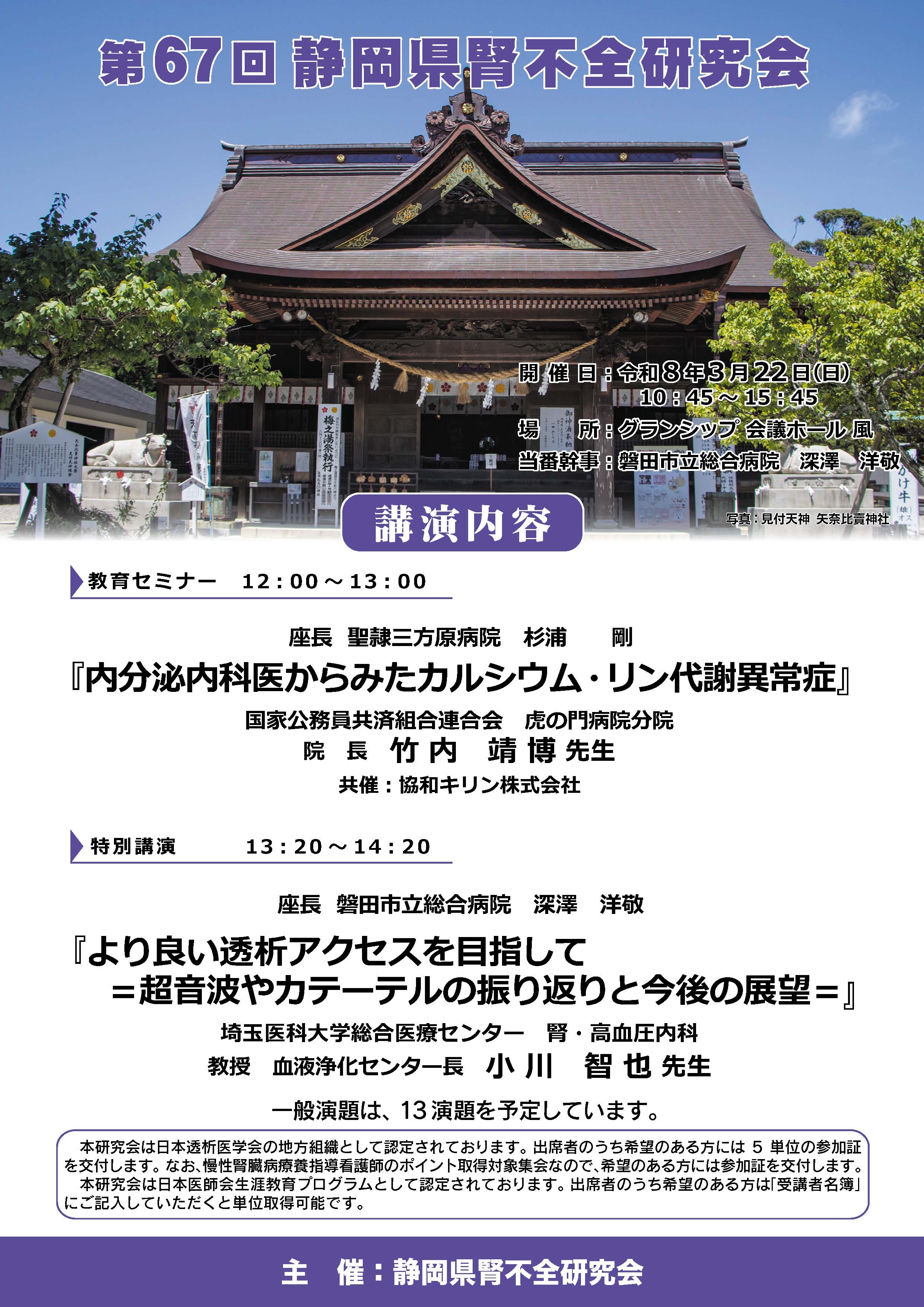 2026年3月22日 グランシップにて「第67回静岡県腎不全研究会」が行われ、当院からは奥院長と鈴木看護師が講演を行いました。